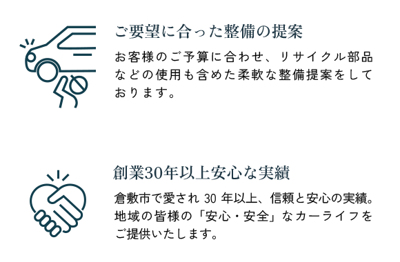 代車を無料で手配いたします。また、車検後の2年間保証を付帯いたします。(最大30万円まで)